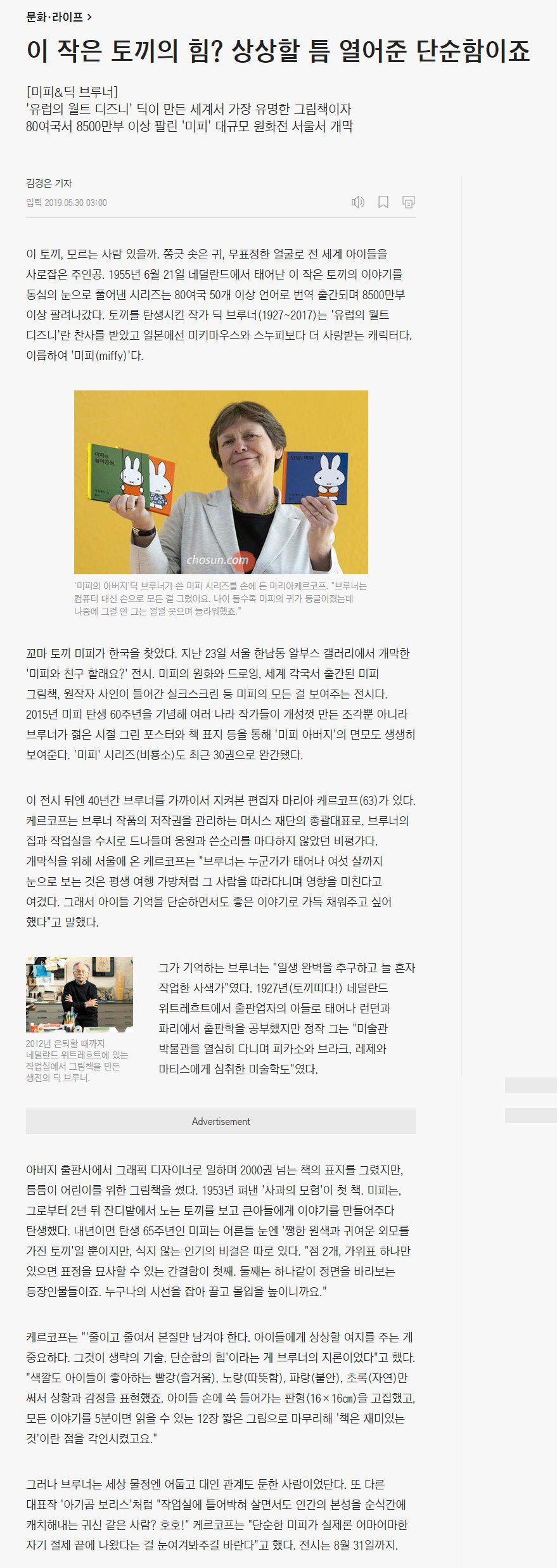 조선일보 2019.5 '딕 브루너_이 작은 토끼의 힘? 상상할 틈 열어준 단순함이죠'